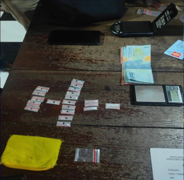 Berbagai barang bukti berhasil diamankan dalam operasi ini, yaitu 20 (dua puluh) pocket narkotika jenis sabu dengan total berat sekitar 1,96 gram, 1 (satu) buah dompet kecil berwarna kuning sebagai tempat penyimpanan narkotika, 1 (satu) unit ponsel merek Xiaomi Redmi warna biru navy, Uang tunai sejumlah Rp 2.450.000,- yang diduga berasal dari penjualan narkotika, Celana pendek berwarna abu-abu, 1 (satu) unit timbangan digital merk CAMRY, 19 (sembilan belas) buah plastik klip bening tanpa isi