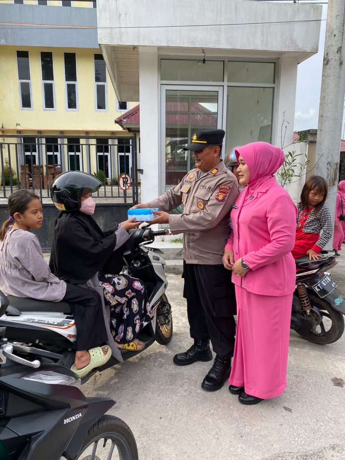 Polres Bontang- Kapolsek Bontang Selatan didampingi Pengurus Bhayangkari Ranting Polsek Bontang Selatan bagi-bagi takjil jelang buka puasa di depan Mako Polsek Bontang Selatan, Minggu (2/4/2023)