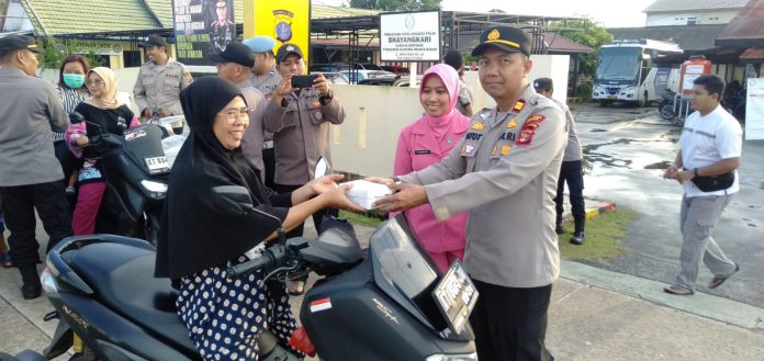 Polres Bontang- Kapolsek Muara Badak didampingi Pengurus Bhayangkari Ranting Polsek Muara Badak bagi-bagi makanan siap saji jelang buka puasa di jalan binaraga Desa Muara Badak Ulu Kecamatan Muara Badak, Jumat (14/4/2023)