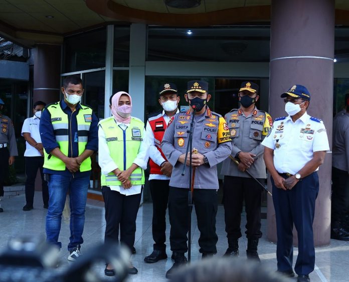 Merak – Kapolri Jenderal Listyo Sigit Prabowo meninjau arus mudik di Pelabuhan Merak, Banten, Sabtu, (30/4/2022). Dalam tinjauannya, Kapolri memantau baik melalui udara dan mendengarkan langsung pemaparan langsung dari otoritas setempat terkait dengan penanganan serta pengendalian arus mudik.