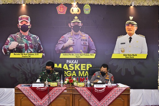 JAKARTA – Panglima TNI Marsekal Hadi Tjahjanto bersama Kapolri Jenderal Listyo Sigit Prabowo memimpin rapat penanganan dan pengendalian Covid-19 bersama dengan Forkopimda Bantul dan Sleman, Daerah Istimewa Yogyakarta (DIY), Minggu (8/8/2021).