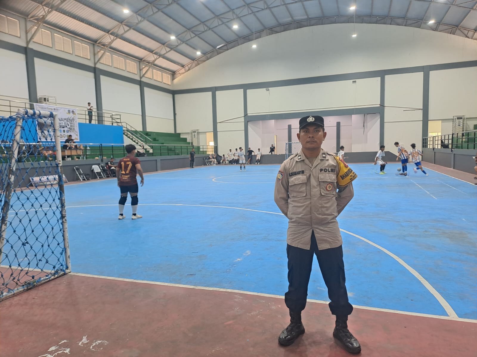 Aiptu Bambang Sumantri, S.H. menyampaikan bahwa kehadiran personel Polri bertujuan memastikan seluruh rangkaian turnamen berjalan aman, tertib, dan kondusif. “Kami lakukan pengamanan terbuka dan tertutup, mulai dari pintu masuk, area tribun penonton, hingga parkir kendaraan. Ini bentuk komitmen Polri mendukung kegiatan positif pelajar,” ujarnya.