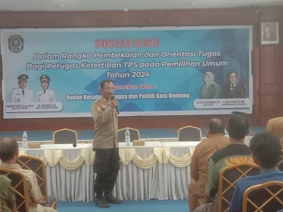 Polres Bontang – Kasubag Kerma Polres Bontang AKP Sodik Suhartanta menjadi nara sumber dalam pembekalan dan Orientasi Tugas Bagi Petugas Ketertiban TPS Pada Pemilu Tahun 2024 di Auditorium 3 Dimensi Jalan Awang Long Kelurahan Bontang Baru Kecamatan Bontang Utara, Senin (29/1/ 2024) pukul 14.30 Wita.