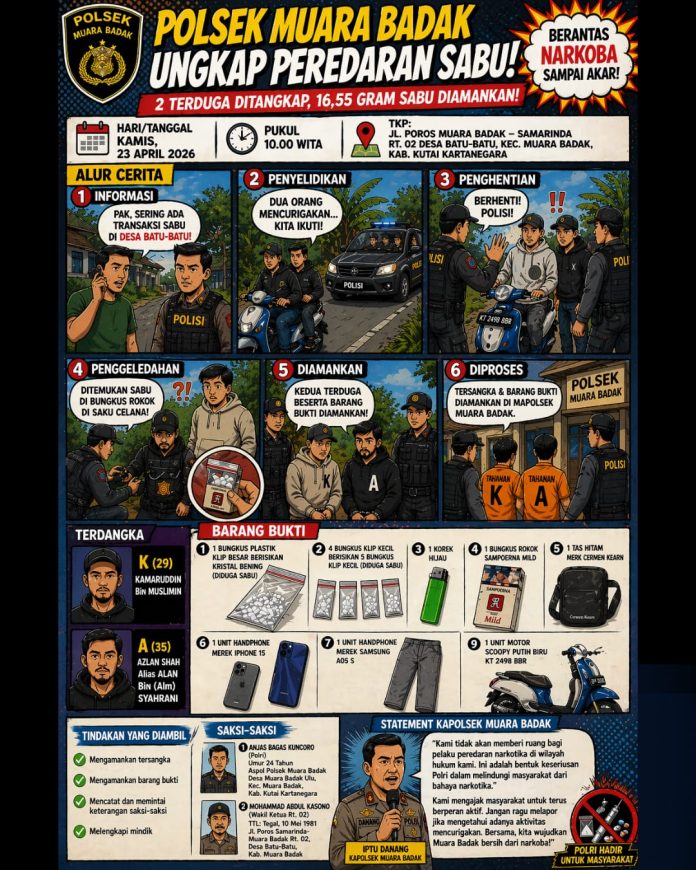 Bontang – Upaya pemberantasan narkotika kembali ditegaskan aparat kepolisian. Unit Reskrim Polsek Muara Badak, berhasil mengungkap tindak pidana narkotika dan mengamankan dua pria yang diduga kuat terlibat dalam peredaran sabu di wilayah Kecamatan Muara Badak, Kabupaten Kutai Kartanegara, Kamis (23/4/2026) sekitar pukul 10.00 Wita.