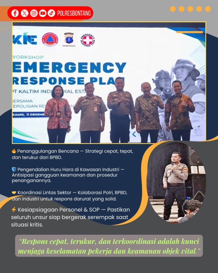 Bontang — PT Kaltim Industrial Estate (KIE) bersama Polres Bontang menggelar Kegiatan Kontijensi Emergency Response Play 2025 di Grand Equator PT Pupuk Kaltim, Jl. Pupuk Raya, Kelurahan Guntung, Kamis (11/12/2025). Kegiatan ini diikuti sekitar 50 peserta dari unsur industri, kepolisian, dan BPBD sebagai bagian dari peningkatan kesiapsiagaan kawasan industri.