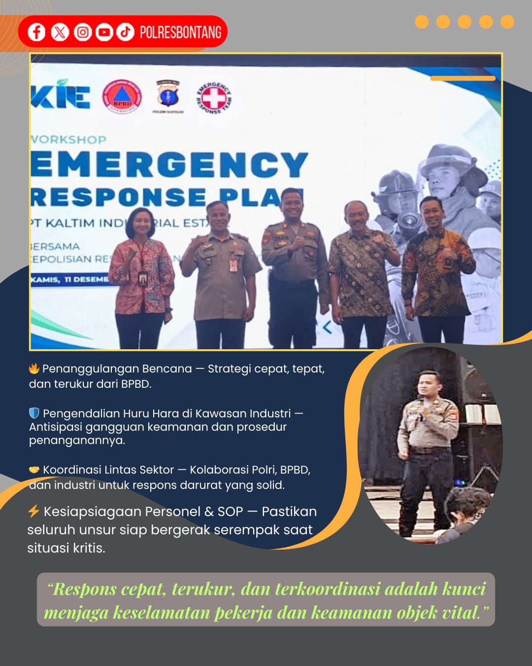 > “Kawasan industri adalah objek vital yang memerlukan respons cepat, terukur, dan terkoordinasi. Melalui latihan kontijensi ini, kita memastikan seluruh unsur mampu bergerak serempak, memahami SOP, dan meminimalkan risiko terhadap keselamatan pekerja maupun masyarakat.”