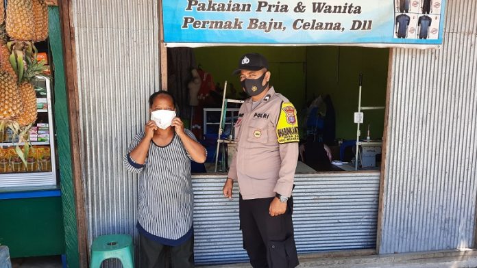 Dalam pelaksanaan patroli petugas melakukan pendekatan yang humanis kepada warga. Salah satunya adalah edukasi sambil membagikan masker gratis untuk warga.