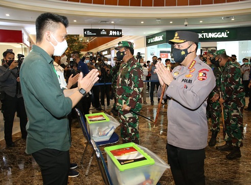 JAKARTA – Panglima TNI Marsekal Hadi Tjahjanto dan Kapolri Jenderal Listyo Sigit Prabowo meninjau langsung serbuan vaksin di wilayah Kalimantan Barat yang digelar di dua tempat yaitu di Ayani Mega Mall dan SMAN 1 Pontianak, Rabu (8/9/2021).