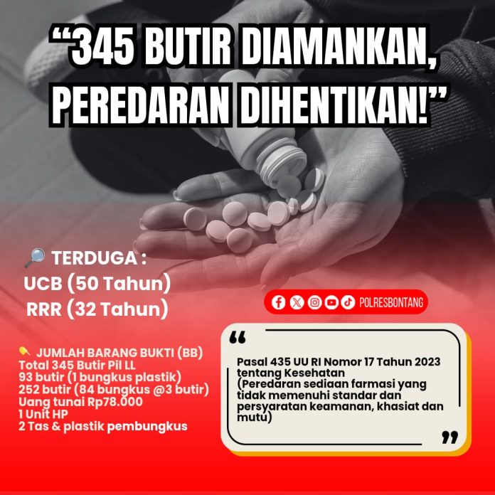 Terduga masing-masing berinisial UCB (50) dan RRR (32). Dari tangan UCB, petugas menemukan 1 bungkus plastik berisi 93 butir pil LL serta 84 bungkus masing-masing berisi 3 butir, dengan total keseluruhan 345 butir pil LL. Selain itu, turut diamankan dua tas, satu plastik bening, uang tunai sebesar Rp78.000, serta satu unit handphone yang diduga digunakan untuk transaksi. Hasil pemeriksaan awal terduga UCB mengaku mendapatkan pil LL tersebut dari terduga RRR.